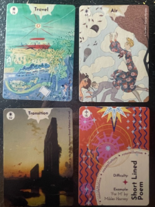 These cards sync up in a variety of ways—air travel, air as transitory space, the transitioning of space as you travel through it, etc. Whether your poem documents real or imaginary travel (alien spaceship, anyone?), use the short lines in your poem to keep up a sense of rapid pace.