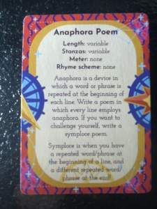 I don’t see too many contemporary poems that are heavy on anaphora, perhaps because it’s difficult to make the language sound natural. But anaphora can at least offer a spine for the poem, both physically and thematically. The “I am” repetition in “The Delight Song of Tsoai-talee” is a good example of this.